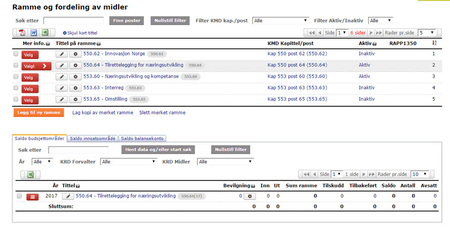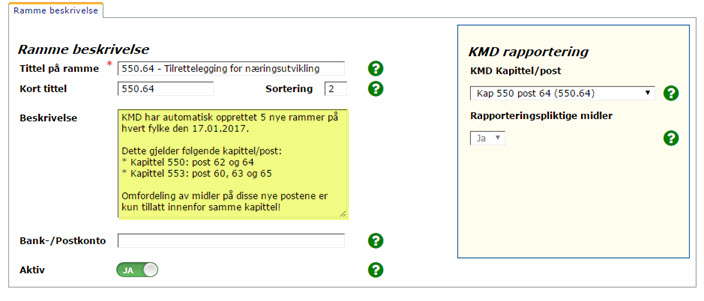 Som vist på bildet er 2 av rammene satt til aktiv og 3 er satt til inaktiv. Rammene er helt ordinære rammer som administrator i forvalter-rollen kan redigere. For hver av rammene er det opprettet ett budsjettområde i 2017. Mal for tittel og metainformasjon på rammene er hentet fra slik de er opprettet i Nordland fylkeskommune.