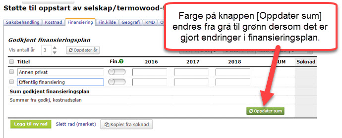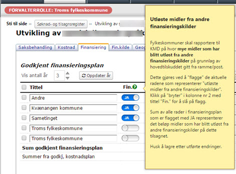 I nylig utsendt oppdragsbrev til fylkeskommunene krever KMD rapportering på utløste midler fra andre finansieringskilder med bidrag fra posten. Dette gjør dere under saksbehandling og fanen "Finansiering" som vist på bildet under.