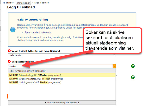 4.Ny funksjonalitet for søker på skjermbilde ved opprettelse av ny søknad. Ny søkemulighet som på støtteordninger direkte i skjermbildet.