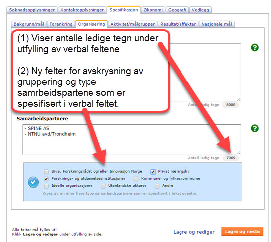 Innlegging av type samarbeidspartnere på standard søknadsskjema.
