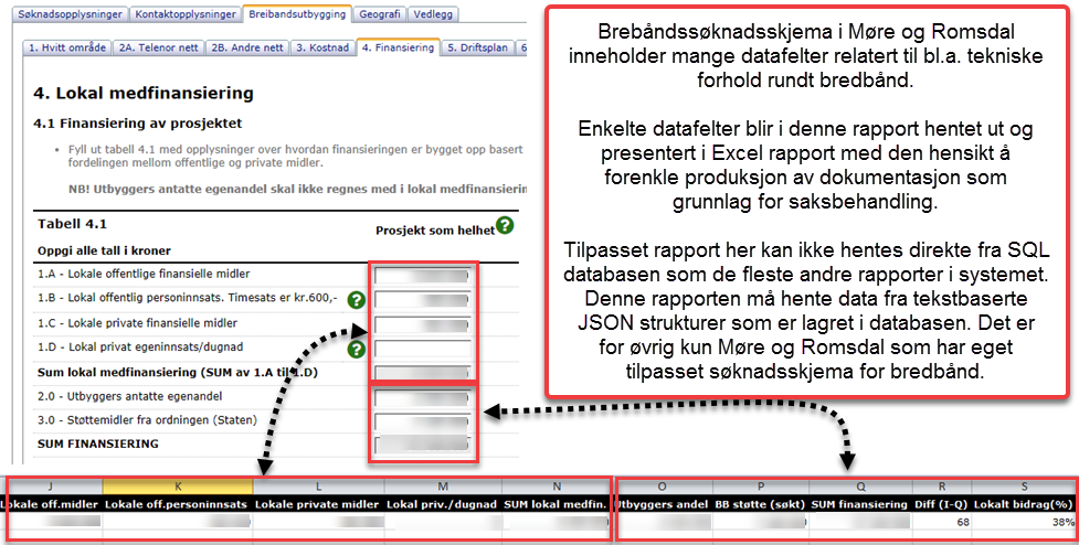 Etter spesifikasjon har vi publisert 2 stk. tilpasset Excel rapporter relatert til bredbåndsutbygging. Disse rapportene er kun tilgjengelig i forvalter-rollen Møre og Romsdal fylkeskommune. Rapportene inneholder utvalgt informasjon innlagt på tilpasset søknadsskjema benyttet for bredbåndsutbygging.