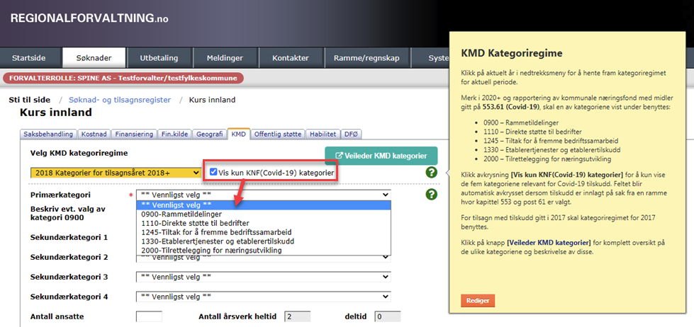 I forbindelse med rapportering på bruk av KNF Covid-19 midler i 2020, må saksbehandler velge "KMD kategori" som dokumentert i kategoriveileder.