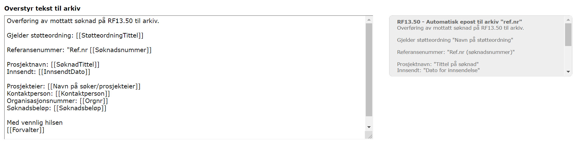 Ønsker at det skal være mulig å tilpasse en helt egen tekst (med fletting) ved oversendelse av søknad til arkiv. Både tekst og tittel/emne på e-post som sendes. Arkivering av saker blir lettere når man har en overskrift som passer bedre med det man faktisk skal ha i arkivsystemet. F.eks på en utlysning ønsker vi at alle søknader skal ha tittel "ordning" - "tittel på søknad". Når vi skal importere e-poster over i arkivsystem blir tittelen hentet i arkivsystemet, og så må vi manuelt endre teksten til det vi vil ha (som ofte er støtteordning + tittel).