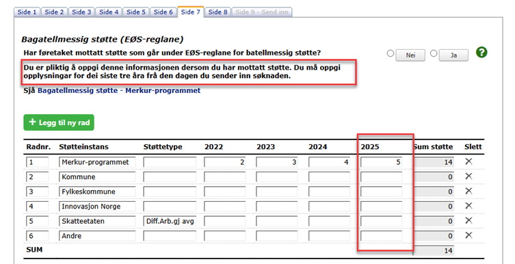 Ekstra kolonne for nytt årstall lagt til for innlegging av bagatellmessig støtte. Dette gjelder alle 5 ordninger i Merkur-programmet.