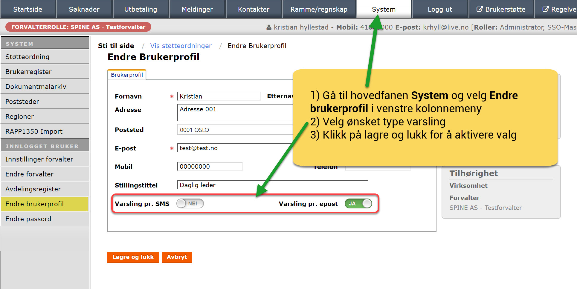 - Her kan både saksbehandlere og administrator endre varsling pr e-post og sms.