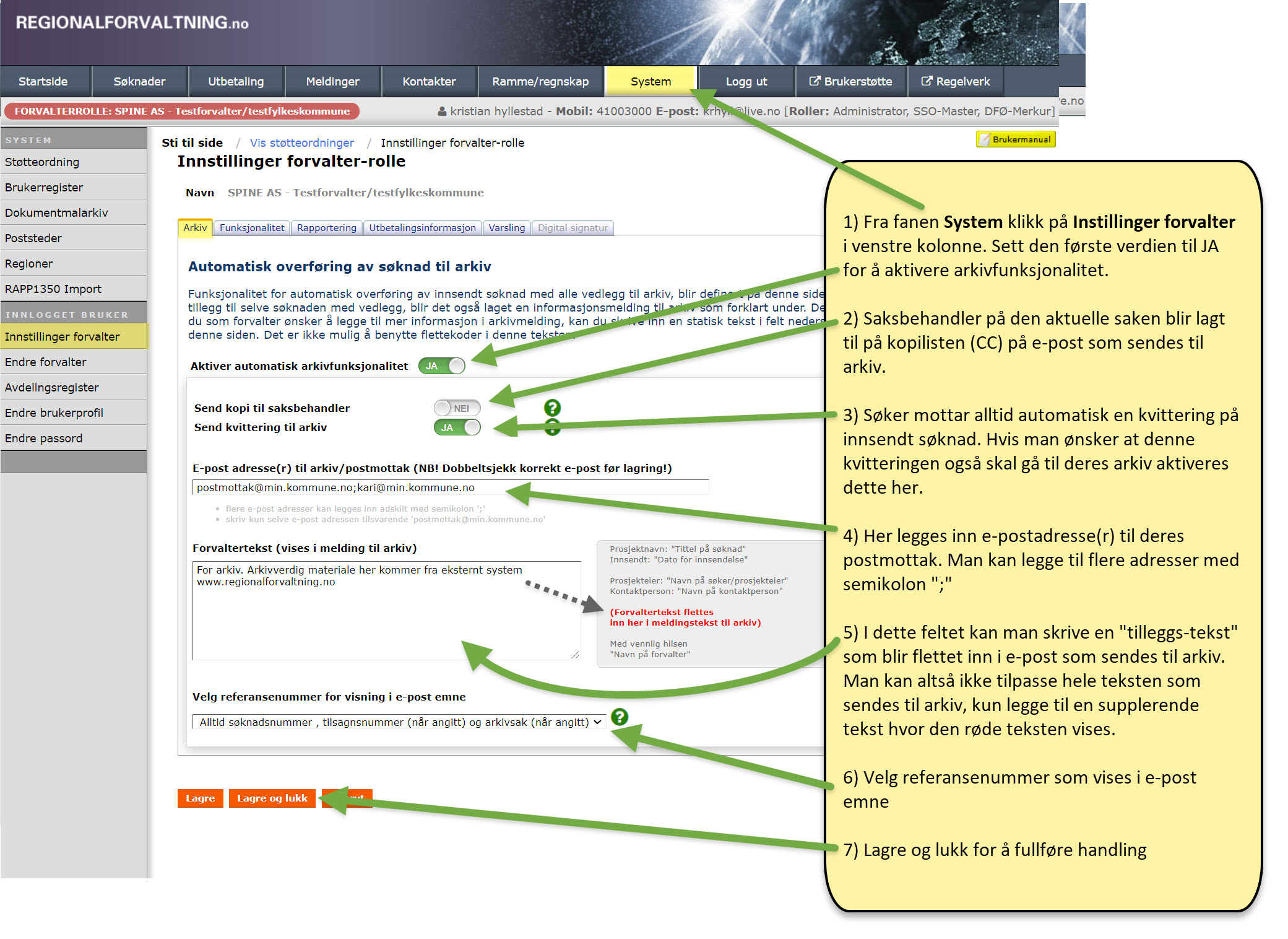 I denne artikkelen viser vi hvordan Administrator i forvalter-rollen aktiverer funksjonen for automatisk overføring av søknad til arkiv. Som standard er arkivfunksjonalitet ikke aktivert. For å ta i bruk denne funksjonen må forvalter manuelt aktivere og legge inn e-post til kommunens/fylkeskommunens postmottak.