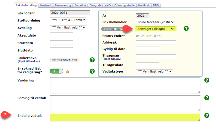 Fane 1 "Saksbehandling": Velg korrekt prosjektstatus (innvilget) og legg inn endelig vedtak.