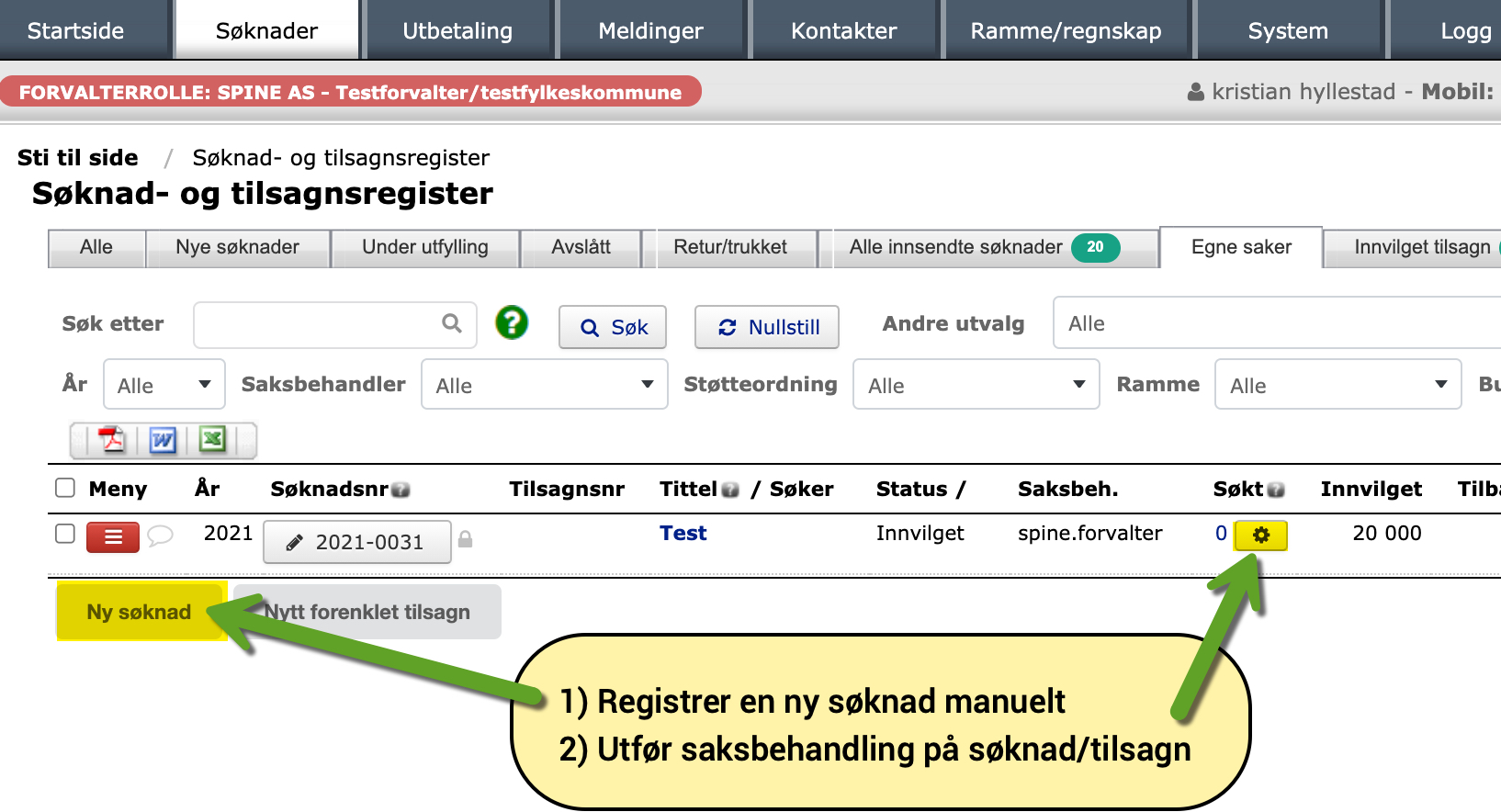 Tips: Når man registrerer søknader manuelt anbefaler vi å stå i filtreringsfanen "Egne saker" (se fanene over søknadsregisteret) for å se en oversikt over alle saker forvalter selv har registrert.